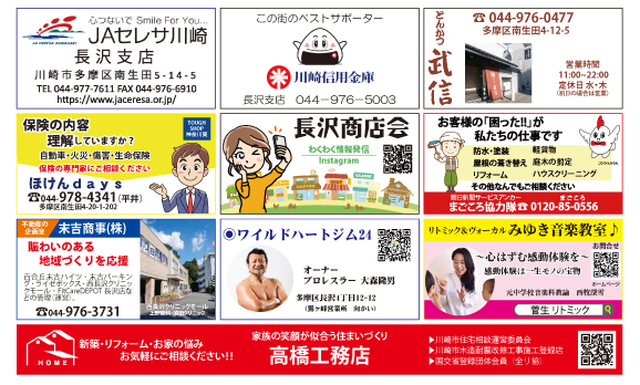 長沢音楽祭[協賛企業] ●JAセレサ川崎 長沢支店 ●川崎信用金庫 長沢支店 ●とんかつ武信 ●有限会社 ほけんdays ●長沢商店会 ●ASA南生田 ASAランド前 ●末吉商事株式会社 ●ワイルドワトージム24 ●みゆき音楽教室 ●高橋工務店 (順不同)